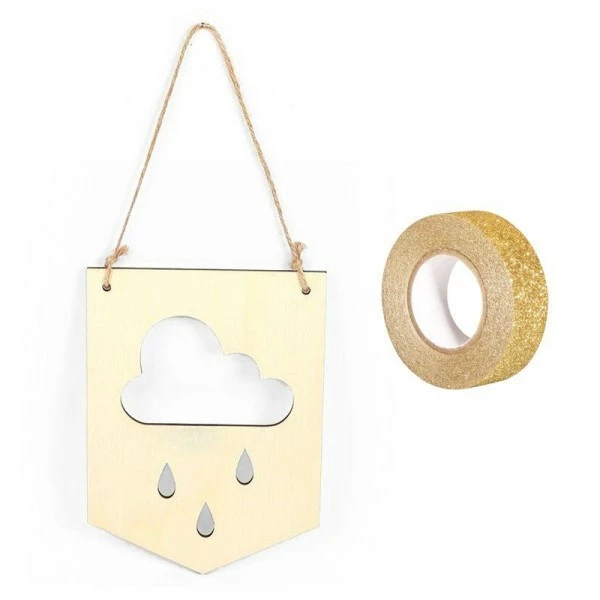 Description de Fanion bois à suspendre 20 x 15 cm Nuage + masking tape doré à paillettes 5 m