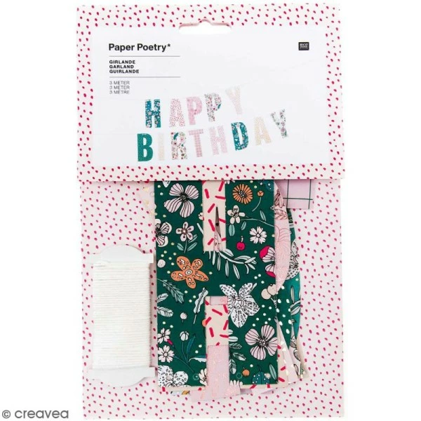 Le kit vous permettra de créer votre Guirlande d’Anniversaire avec le message Happy birthday pour une déco de fête unique ! Ce kit contient 13 lettres d’environ 7,5 x 14 cm au coloris pastel et vert avec des détails métalliques et fluos, dont vous pourrez vous servir pour animer une décoration d’anniversaire. La ficelle blanche de 3 mètres, fournie avec le kit, vous permettra d’accrocher à votre guise cette belle décoration en papier !