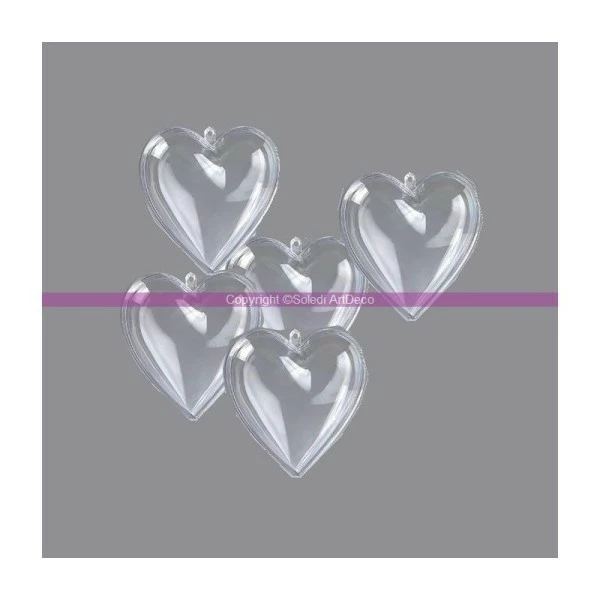 Description de Lot de 5 Coeurs en plastique cristal transparent séparable 6,5 cm, Contenant sécable